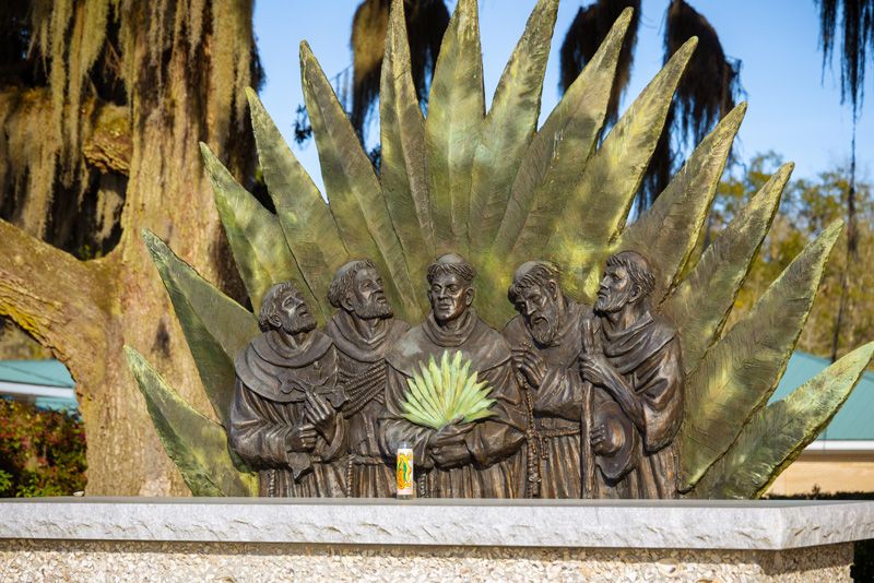 Fray Pedro de Corpa, one of five Franciscans, was killed during the Juanillo Rebellion of 1597 at the mission of Tolomato, believed to have been close to Darien. The Diocese of Savannah is presently pursuing a Canonization Cause of Sainthood for Fray Pedro de Corpa and his four companions. You can learn more about The Georgia Martyrs here. In 1997, a celebration at Nativity of Our Lady was held to educate and celebrate the story of Fray Pedro de Corpa and Companions. Local artist Marjorie Lawrence created a sculpture of the five martyrs, which is currently hanging in St. William’s Parish, St. Simon’s Island. A new monument to the Five Friars of Georgia, created by internationally renowned artist Timothy Schmalz, was installed and dedicated on October 9, 2021, by Bishop Stephen D. Parkes (bishop of the Diocese of Savannah), Archbishop Gregory John Hartmayer, OFM Conv. (Archbishop of Atlanta and the previous bishop of the Diocese of Savannah), and Bishop Kevin Boland (Bishop Emeritus of the Diocese of Savannah). You can learn more about the Georgia Martyrs at their official website here.